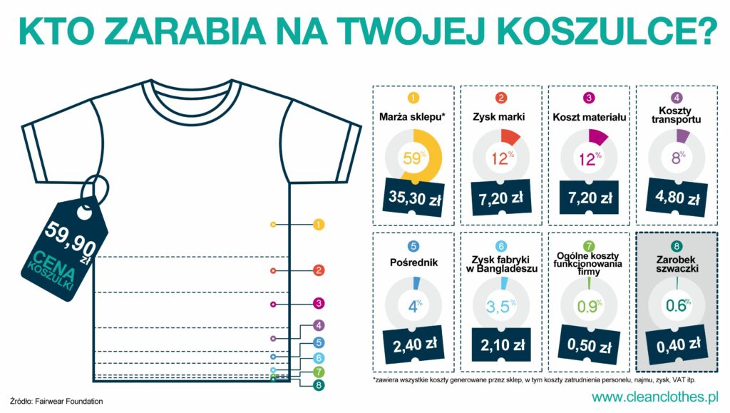 Jeden obraz, a pokazuje całą rzeczywistość produkcji znanych sieciówek. Osoba wkładająca najwięcej pracy w powstanie tego ubrania, zarabia poniżej 1% jego wartości. Globalne marki wybiły się na wyzysku ludzi. Teraz my jako konsumenci podejmujemy świadomą decyzję, czy chcemy dalej do tego wyzysku się przyczyniać.